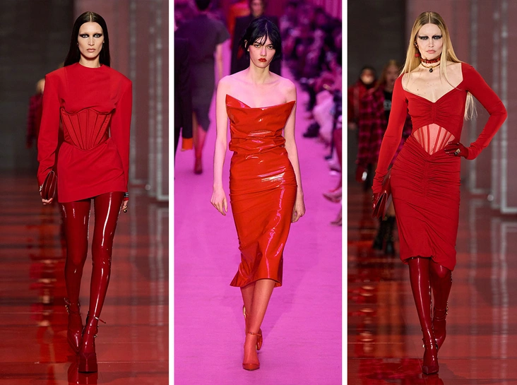 Пару желтым вещам составят красные, хотя многие модные Дома сделали ставку на тотал-луки. Так, Max Mara показали роскошные платья из красной лакированной кожи, которые советуют носить с колготками и обувью в тон, Versace представили модные сочетания с корсетом, латексными легинсами и обувью на высоком каблуке, а Bottega Veneta презентовали эффектные брючные костюмы из красной кожи (читайте также: 60 красных нарядов: как принцесса Диана носила любимый цвет).