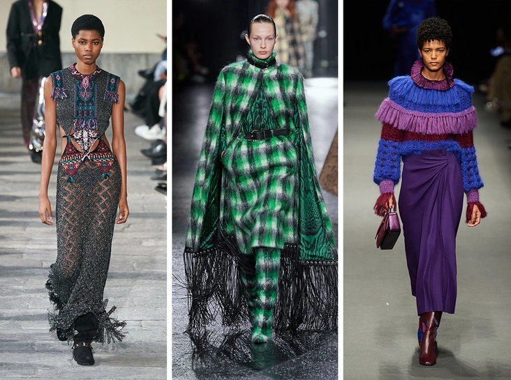 Бахрома — один из самых популярных трендов следующей осени, прокатившийся по всему модному месяцу. В Милане дизайнеры украсили бахромой платья, юбки и пончо, дополнив и без того яркие и броские вещи с пайетками и в цветную клетку.