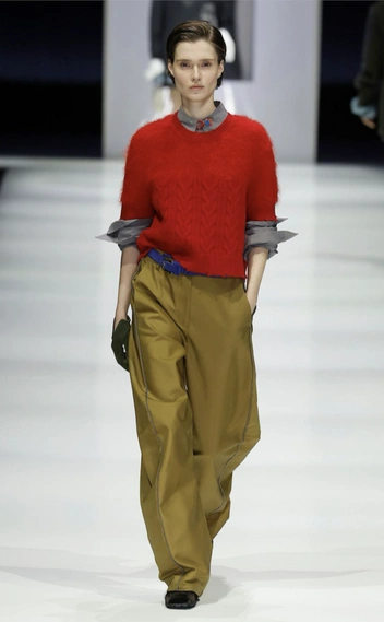 По данным Pinterest запросы на аутфиты в стиле преппи увеличились на 80% к началу сентября 2025, а база ученического стиля — это, конечно, хлопковое или шерстяное поло. Тонкие кашемировые и трикотажные варианты с длинным рукавом уже представили Tommy Hilfiger и Lacoste. Они же настаивают на понятных осенних цветах — глубоком винном (привет, Miu Miu), графитовом и фаворите предстоящего сезона — шоколадном.