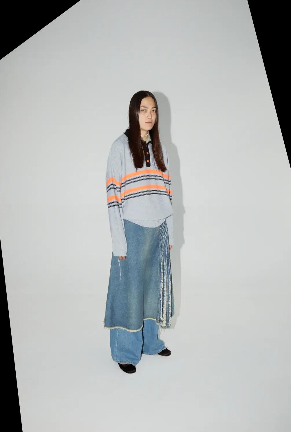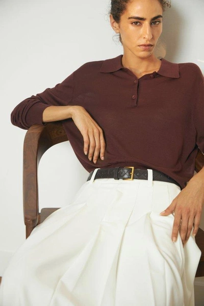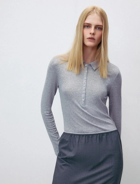 С чем носить свитер-поло осенью 2025? Да с чем угодно. Монохромный из кашемира и шерсти — для делового аутфита с юбкой макси, брюками или мини юбкой. Классический с полоской станет предсказуемым верхом для джинсов и barn jacket на прогулку.