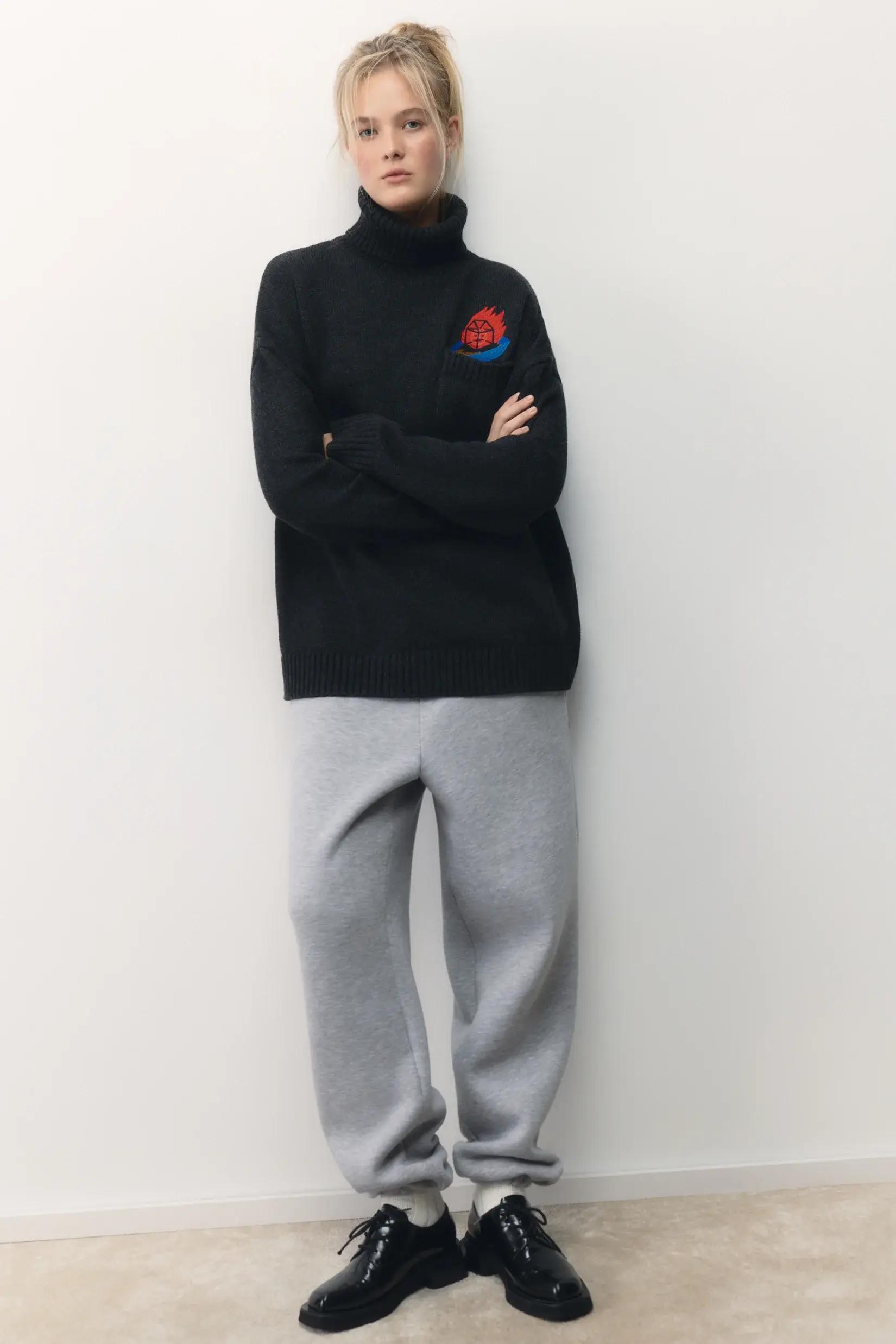 С чем его сочетать? Чтобы образ был органичным, свитер должен быть его главным героем. А потому акцентные джинсы с блестящей вышивкой, яркие кроссовки или сумка необычного силуэта — вещи, которые лучше оставить для других образов. А вот плотные легинсы или свободные джинсы как варианты базового низа вполне подойдут.