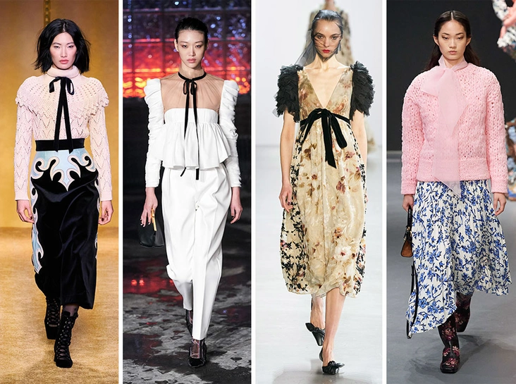 Легкие бантики, может, и выглядят довольно сентиментально и легкомысленно, но в новом сезоне играют исключительно роль незаметной (но крайне важной) детали Повязывайте ленты вокруг шеи, как делали Khaite и Zimmermann, или в виде пояса, как на шоу Brock Collection.