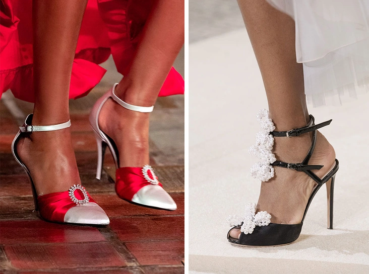 Заметно подустав от ugly-сникерсов, дизайнеры принялись черпать вдохновение в канонической женственности. И хотя элегатные туфли мы видим на подиумах регулярно, сейчас их стало особенно много, а их легкость подчеркивается главными составляющими-клише – милыми бантиками, девчачьими лентами и декором из камней и страз. Блестящие украшения с камнями, как мы видели у JW Anderson и Versace, жемчужные украшения, как показали Giambattista Valli и Y/Project, отделка перьями, которую мы заметили в Altuzarra и Prada, или причудливые туфли Fendi – все это будет выглядеть одинаково свежо выглядеть и в вечернем образе, как и в ансамбле с футболкой и джинсами.