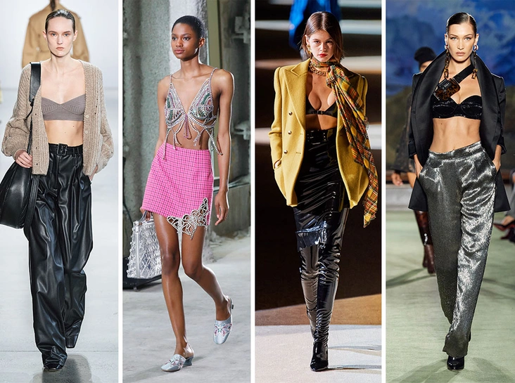 Актуальная альтернатива трендовым корсетам – бельевые бра-топы. Невероятный бум их ждал, когда в тонком трикотажном бюстгальтере с кардиганом от Khaite вышла Кэти Холмс. Сейчас вариантов может быть масса, и вовсе не обязательно сочетать их с комплиментарным верхом. Энтони Ваккарелло в Saint Laurent советует носить бра из латекса вместе с оверсайз-жакетом, трендсеттеры Khaite решают добавить еще больше брутальности образу при помощи кожаного тренча, а Dilara Findikoglu и David Koma предлагают сияющие варианты для вечеринок до утра.