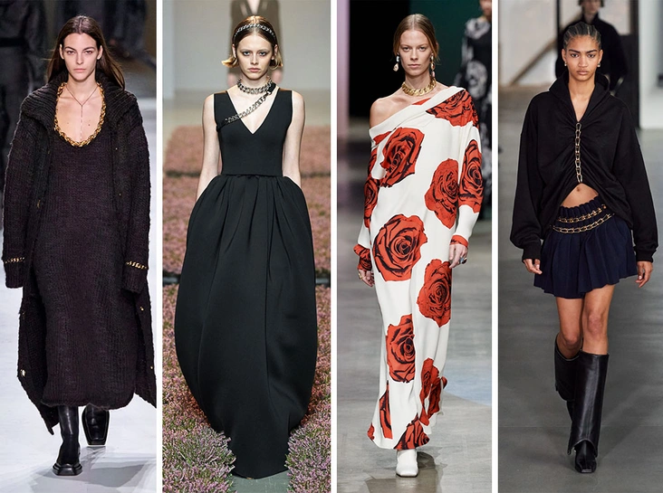 Декор из цепей сейчас везде: и на вырезах, как у Dion Lee и Bottega Veneta, и вместо поясов, как на шоу Rokh и Ports 1961, и на обуви, как у N°21.