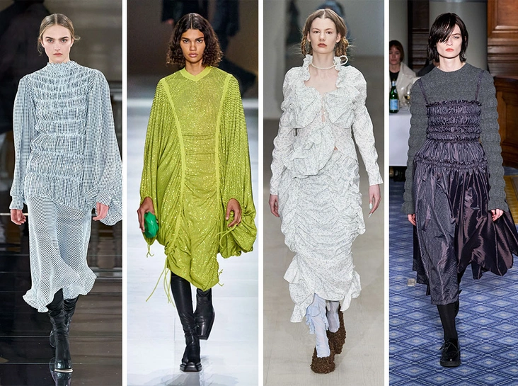 Мягкие драпировки и сборки – отличный способ сделать образ более динамичным. Идеальное платье на каждый день можно присмотреть у Victoria Beckham, а если хотите добавить остроты в вечерний образ, ищите вдохновение у Bottega Veneta и Molly Goddard.