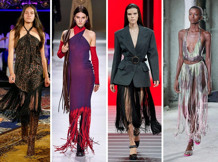 Хотя триумф бахромы мы долгое время наблюдали из-за популярности ковбойской моды, сейчас она совсем не связана со стилем Дикого запада. Длинные нити украшают платья, юбки, обувь, сумки и совсем не делают их похожими на вещи из гардероба одинокого кочевника. А у Area бахрома и вовсе выполнена из сияющих кристаллов – идеальный вариант на вечер.