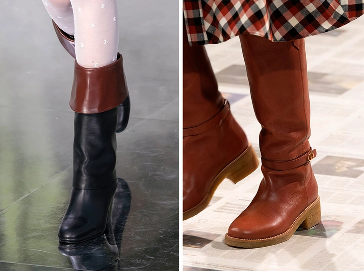 Открытие будущего сезона сезона – сапоги, крайне напоминающие обувь для верховой езды. Удивительно созвучными в выборе оказались Brock Collection, Dior, Valentino и Michael Kors. Сочетать их, конечно, лучше всего с противоположными по стилю элементами – парчовыми юбками и платьями оттенка металлик.