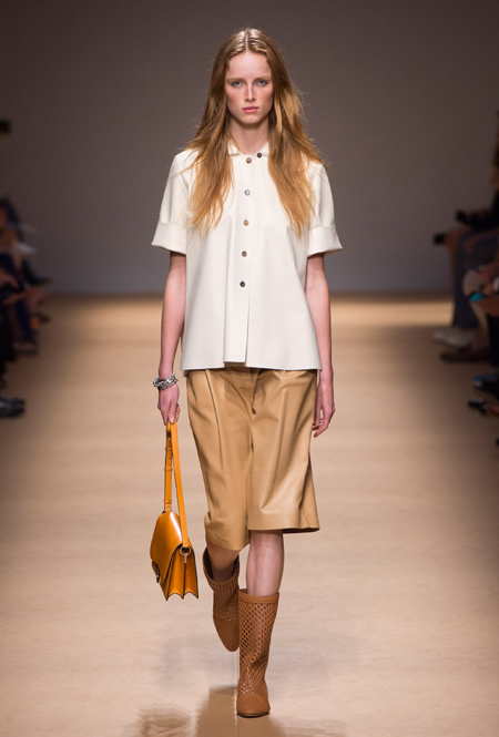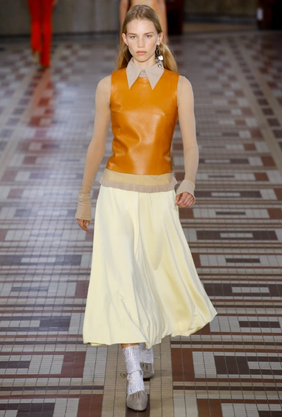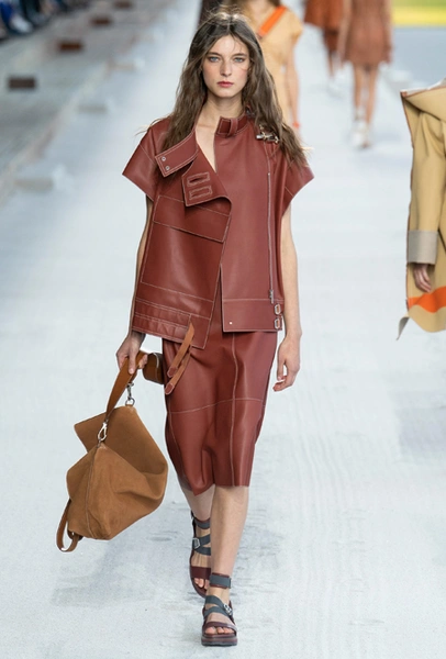 Помешательство дизайнеров на коже, виниле и латексе переходит на следующую стадию: весной и летом носить гиперобъемные пальто и скульптурные куртки просто-напросто некомфортно, а облегченные костюмы — вполне. Miu Miu, например, представили классическую пару из приталенного жакета и юбки, а Hermes — кожаную куртку с укороченными рукавами и контрастной строчкой.
