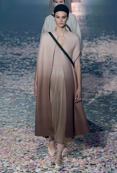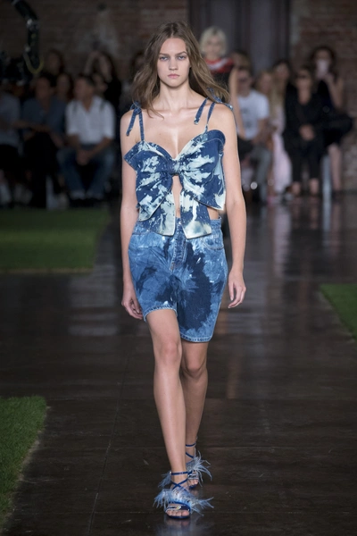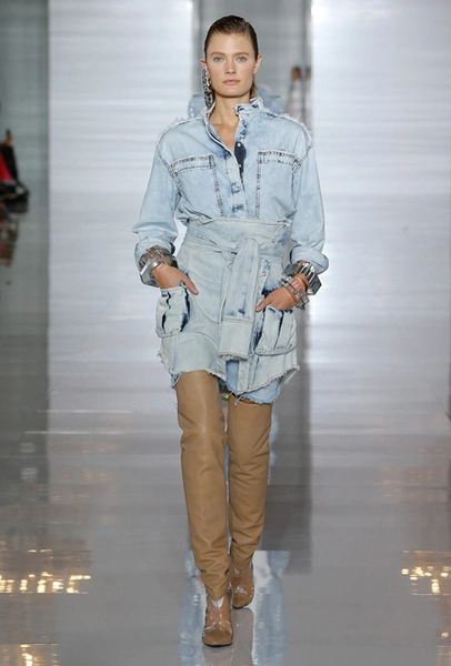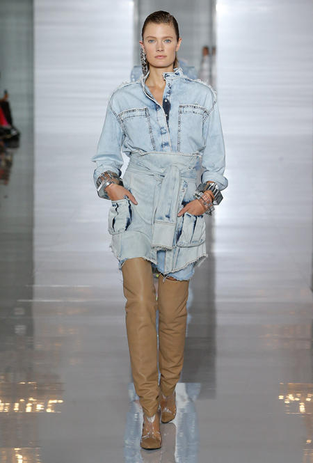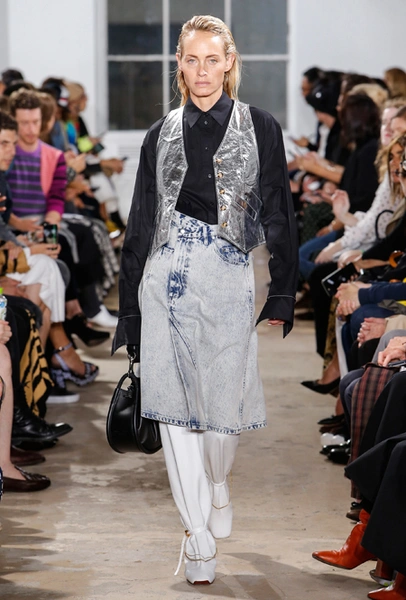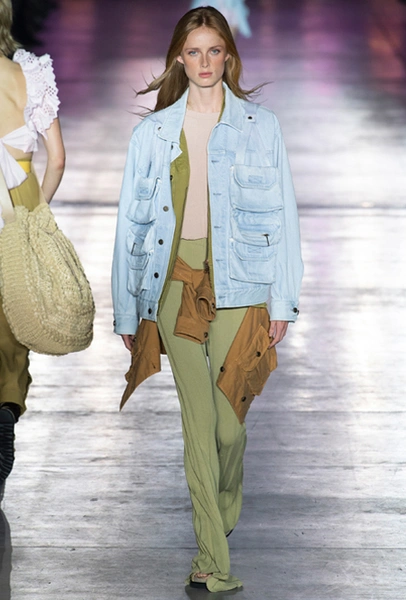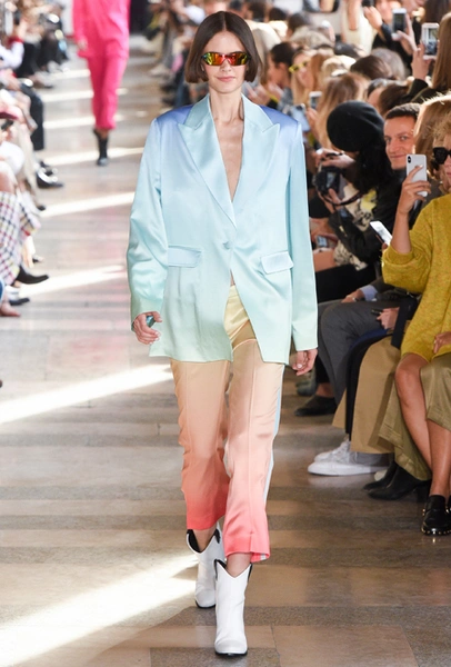 Для тех, кому вареный деним кажется слишком грубым, дизайнеры предложили более нежную альтернативу — деграде или градиент. Мы, кажется, видели уже десятки различных вариантов плавного перехода оттенков, но в новом сезоне он украшает не только струящиеся платья, но и классические пальто.