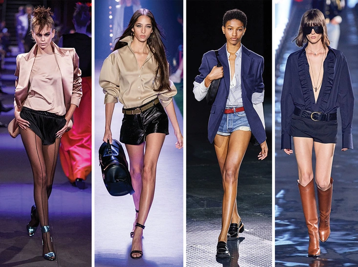 Весной и летом самыми актуальными будут не просто короткие, а ультракороткие шорты, граничащие с нижним бельем. С этим трендом, конечно, стоит быть аккуратными и помнить об уместности, однако варианты, как на показах Longchamp, Saint Laurent и Brandon Maxwell, выглядят очень интересно.