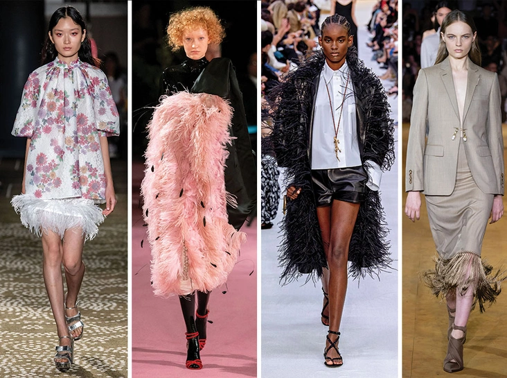 Декор из перьев мы особенно любим за то, что в любых комплектациях они создают особенное праздничное настроение. В новом сезоне дизайнеры оказались удивительно солидарны друг с другом и украшали перьями все: от брюк и пальто до рубашек и платьев. Можно ли носить такие вещи в офис? Можно, говорит нам Рикардо Тиши в Burberry, аккуратно добавляя декор из перьев на подол юбки-карандаш и комбинируя ее с классическим жакетом.