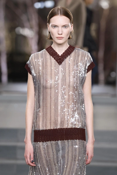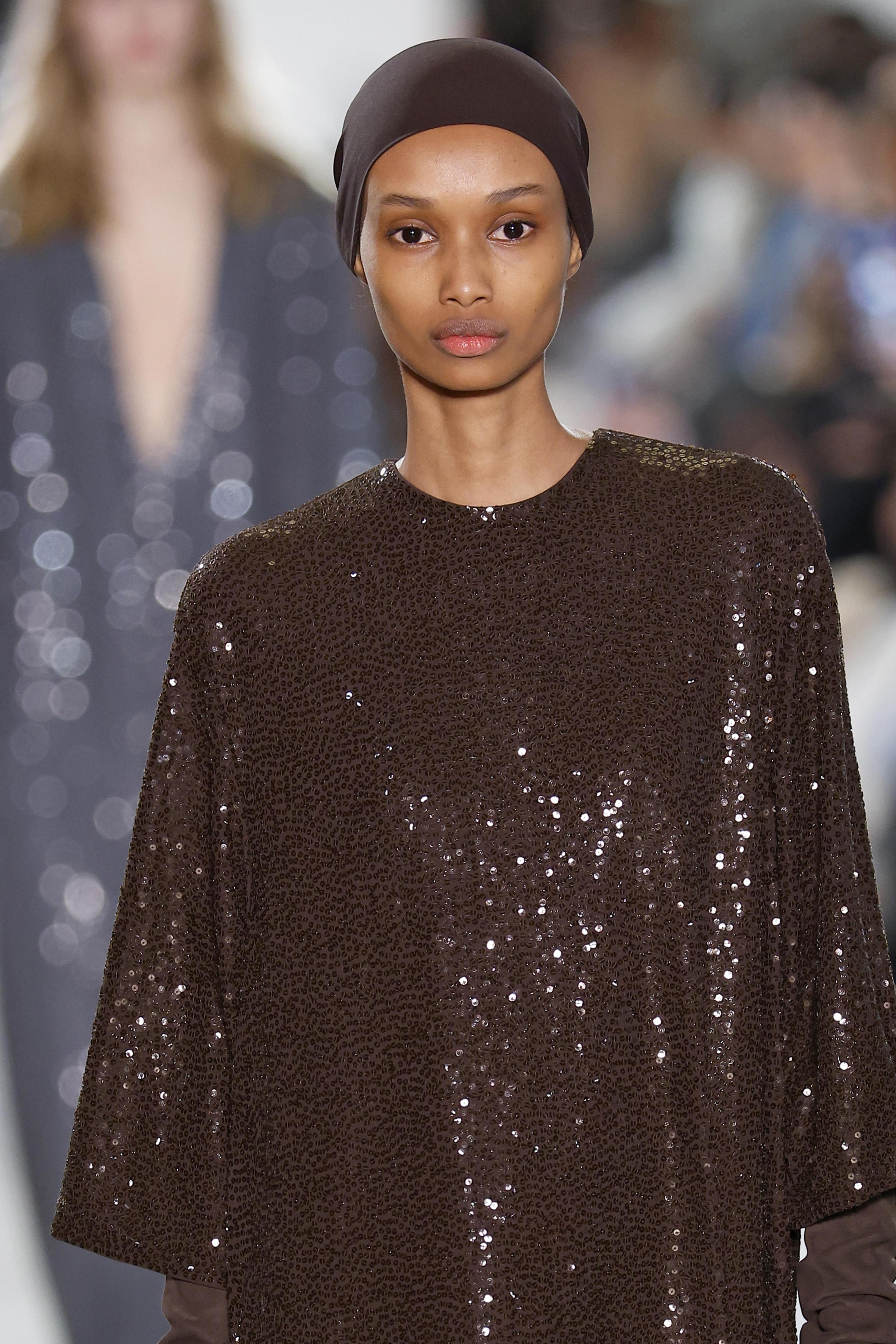 Неожиданный тренд FW/25 в том, что на подиумах появилось много вещей с пайетками, характерными для более теплых сезонов. Правда, носим эту деталь по-зимнему на трикотажных жилетах и даже верхней одежде — такой сверкающий вариант показали Michael Kors. Но и от классики на новогодний корпоратив не отходим — платьев с пайетками на прошедших шоу тоже достаточно.