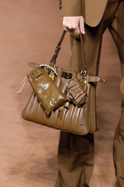 По всей видимости, дизайнеры решили, что брелоков на сумках недостаточно, поэтому и предлагают нам носить два аксессуара сразу. На подиумах видим, как на более крупную сумку крепят другую, поменьше, либо картхолдер или кошелек (небезопасно, но чего не сделаешь ради трендов). Надеемся, что сумки будут продаваться в комплекте, а то слишком-уж накладный стайлинг-прием.