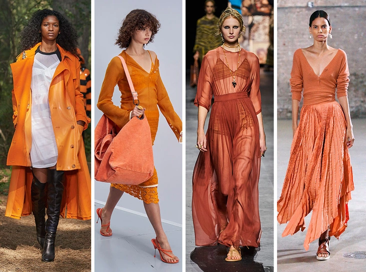 Сочный, яркий, свежий — оранжевый может стать удачной альтернативой, если трендовый ярко-красный для вас выглядит чересчур смело. Особенно настойчиво бренды советуют нам обратить внимание на все возможные фасоны платьев в цвете апельсина. А для прохладной весны можно подобрать себе стильное оранжевое пальто или ветровку, как на шоу Burberry — лучший ответ прохладной погоде и серости.