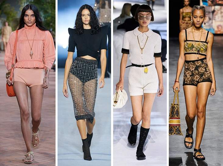 Трикотажные вещи прочнее вошли в наш с приходом локдауна весной 2020. В народе актуальные теплые шорты называют просто: вязаные трусы. Однако дизайнеры придумали более изощренное название для тренда этого года — кникерсы. Номинации могут звучать по-разному, однако от этого наша любовь к ним не становится слабее. При желании вы легко можете носить кникерсы на улицу, сочетая с объемным пиджаком или легкой шифоновой блузой. А для домашнего времяпрепровождения можно приобрести целый комфортный сет из нескольких вещей — вязаных шорт, кроп-топа и кардигана, как на шоу Dior.