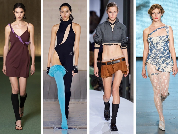 В новом сезоне чулочно-носочные изделия используются не как способ согреться в холода, а в качестве стильного аксессуара. Самый важный принцип — выбирать максимально яркие и контрастные модели, которые, на первый взгляд, выбиваются из образа. Если же вы предпочитаете классический гардероб, присмотрите себе лаконичные серые и черные модели и носите их с образами в стиле преппи, как на шоу Miu Miu.