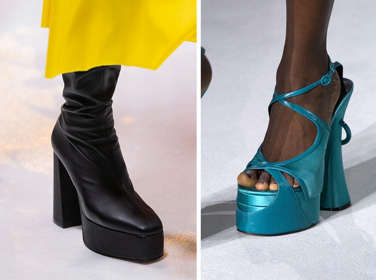 Самый главный опознавательный знак трендовой модели обуви — массивная (если не сказать гигантская) платформа. На подиумах бренды предложили массу различных вариантов — от классических сапог с присборенным голенищем Richard Quinn до красочных босоножек Versace, которым гарантированно обеспечен sold-out. Приобретайте модель, которая будет комфорта вам, но лучше — самых ярких и сочных оттенков.