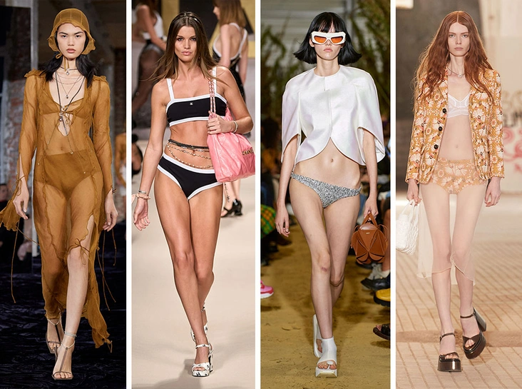 Прошлой зимой и летом мы с удовольствием носили кникерсы (или трикотажные трусы) дома, сочетая их с подходящим кроп-топом. Теперь дизайнеры советуют немного раскрепоститься и носить на выход трусы от купальника. К тому же, этот тренд отлично ладит с другой тенденцией — прозрачными вещами. Вместе эта пара составит идеальный тандем.