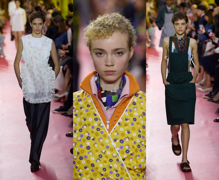 В этом сезоне дизайнеры переосмыслили «женские профессии». Miu Miu ярко заявляют об этом, демонстрируя на подиуме декоративные и функциональные фартуки — будто напоминая, что одежда всегда была и остается инструментом для жизни. Этот сезон — дань уважения многогранности женщины, которая ежедневно совмещает множество ролей и профессий: это и про силу, и про нежность, и про способность адаптироваться к любым вызовам. В общем, быть простой русской женщиной — теперь главный тренд.