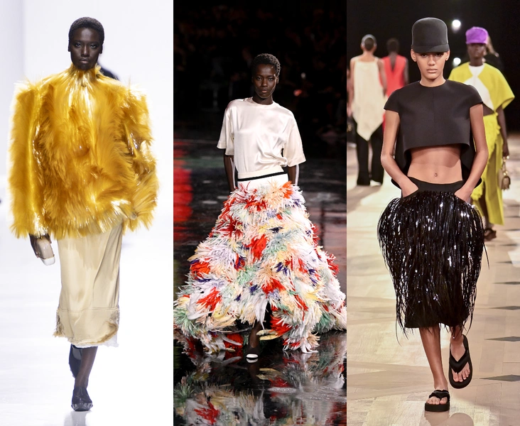 В этом сезоне бахрома и ее ближайшие родственники — пояса, ленты, длинные шлейфы — становятся главными героями образов. На подиумах они словно плывут и играют с нашими взглядами. Так Луиз Троттер в Bottega Veneta создала «бахрому нового поколения» — дизайнер продемонстрировала куртку из переработанного стекловолокна, а финальный образ на дебютном показе Матье Блази для Chanel — платье с перьевыми бутонами — стал еще одним современным взглядом на бахрому.