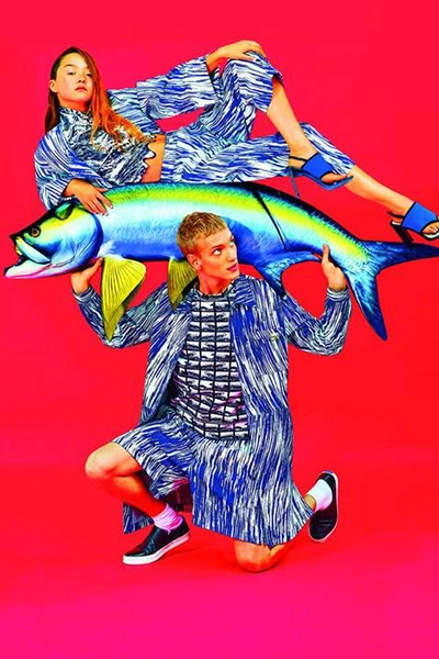 Яркие цвета стали главными и для Kenzo в этом сезоне, который дизайнеры Кэрол Лим и Умберто Леон (Carol Lim и Humberto Leon) посвятили защите океанов. Одежду бренда демонстрируют модели Дэвон Аоки (Devon Aoki) и Пол Боше (Paul Bosche).