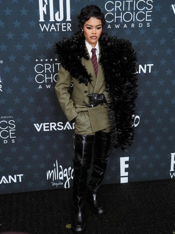 А вот ее «мама» по фильму «Битва за битвой», Тейяна Тейлор, позировала перед камерами в совершенно противоположном образе. Она выбрала костюм мужского кроя Saint Laurent, который дополнила рубашкой, галстуком, высокими ботфортами и меховой накидкой. Отдельное внимание на руки — прямо поверх кожаной перчатки на мизинце актрисы красуется перстень.
