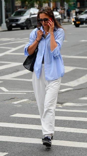 Чаще всего трикотажные брюки представлены в комплекте с джемпером в тон — это отличная формула готового образа. Но и по отдельности их можно легко сочетать с другой одеждой, например, с рубашками, как это делает актриса Кэти Холмс (читайте также: Думать не надо: 6 моделей брюк, которые подходят к любому верху).