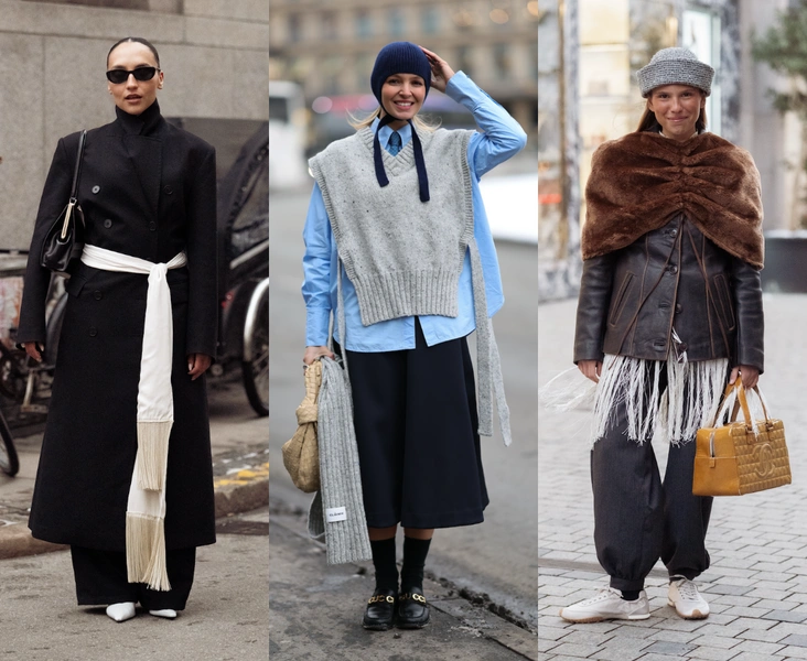 Скандинавская многослойность давно ушла от классической формулы «рубашка плюс свитер». Сейчас это почти фешн-архитектура: тонкий первый слой у тела, сверху блуза или платье, затем жакет, пальто и финальный штрих в виде длинного шарфа или мехового палантина.