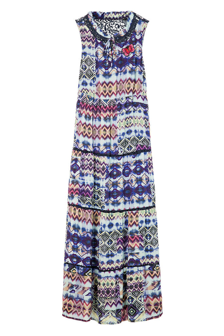 Образ в стиле boho chic: белый свитер с коротким рукавом поверх длинного сарафана с этническим принтом. Идеально подойдет для поздней весны или прохладного лета и сделает вас похожей на гостью фестиваля Coachella. Финальный штрих – большой и вместительный розовый рюкзак.