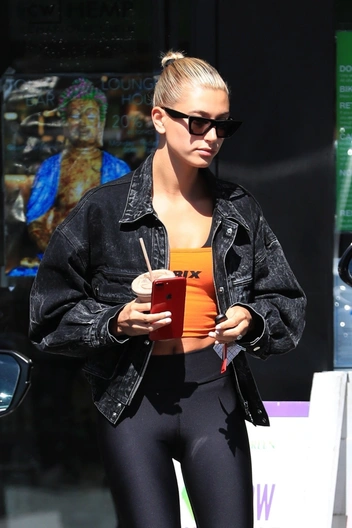 Модель и признанный трендсеттер Хейли Бибер каждый раз вдохновляет нас своими луками. Ей легко удается создавать расслабленные, комфортные и, главное, нескучные образы. Хейли выбрала черные леггинсы, акцентный яркий топ и создала баланс пропорций с помощью объемного верха — укороченной джинсовой куртки. Берите на заметку: такой прием зрительно удлиняет ноги и сужает талию.