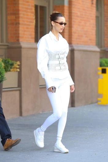 Белла Хадид — главная модная икона, которой под силу превратить обыкновенный аутфит в самый обсуждаемый (читайте также: Как составлять нескучные наряды из базовых вещей: лучшие сочетания для зимы 2022, которые вам стоит попробовать). На этот раз супермодель выбрала белоснежный образ: леггинсы и объемную рубашку. Акцент она сделала на талии, повторить его можно, надев широкий ремень. В ноябрьскую погоду мы предлагаем завершить выход пальто.