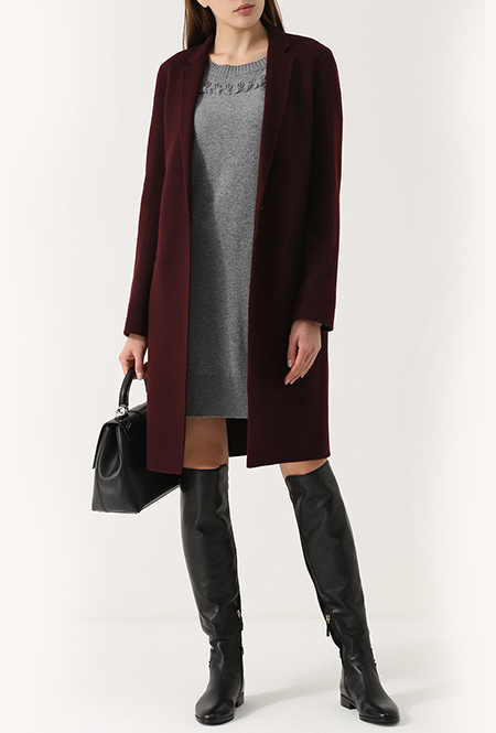 Такой простой наряд подойдет даже для офиса, но только в том случае, если у вас нет строгого дресс-кода. Что касается верхней одежды, мы рекомендуем сыграть на контрасте и к объемному длинному свитеру с мягкой фактурой и плавными линиями добавить жесткости в виде бушлата и камзола, завершив образ лаконичной сумкой на цепочке среднего размера.