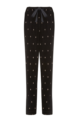 Прямые брюки со свободными штанинами в 20-е годы были самым универсальным атрибутом показательной модницы. Как для ежедневного образа, так и для коктейля в высшем обществе они удовлетворяли все притязания. Так, наиболее громогласно о себе заявляют бархатные брюки в пижамном стиле. Блузы к ним дизайнеры начинают создавать таким образом, чтобы те выгодно подчеркивали зону декольте, декорируя при этом предмет гардероба перьями и вышивкой из бисера. Тем временем меховая накидка выводит весь образ на качественно новый и престижный уровень.