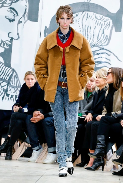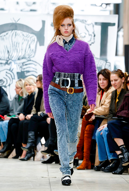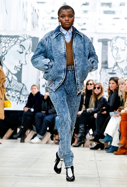 «Джинса» характерного цвета. В 80-е и в начале 90-х модники специально варили джинсы и куртки в кипятке в тазу – все для того чтобы они полиняли и покрылись обязательными в те годы белыми «прожилками». Разумеется, Миучча нужного эффекта добилась иначе, но разницы никакой: ее «вареный» деним совершенно точно прошел бы фейсконтроль любой it-girl из 80-х. Кстати, у джинсов в коллекции завышенная талия, а сверху – резинка. Тоже характерные приметы той эпохи.