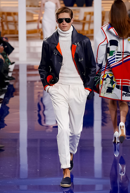 Белыми вещами весной и летом уже никого не удивить, а вот их небанальным сочетанием – попробовать можно. Мужская половина у Лорена под белоснежный пиджак надевает белый свитер в косичку, дополняя все это кипенными брюками и такими же эспадрильями, а женская – платья с бомберами, украшенные контрастным кантом и лодочками в тон.