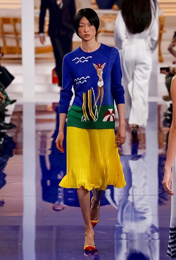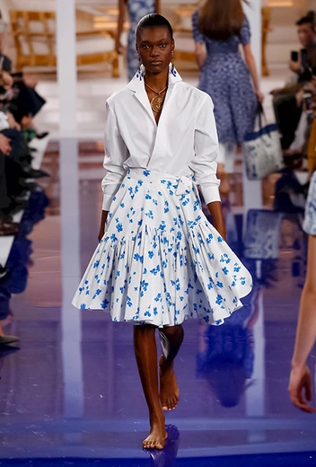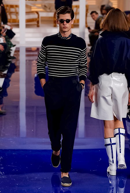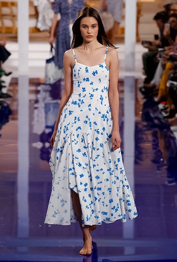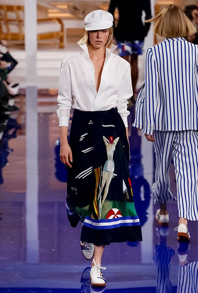 Показ начался совсем не с тельняшек и ремней с якорями на бляхах, как можно было подумать, а с платья, сарафана и юбки в мелкий цветочный принт-мильфлер, уводящих в сторону от главной темы коллекции. Меж тем, именно они обещают стать одними из главных хитов, ведь романтичная коннотация таких вещей – отличная основа для самых разных стилистических экспериментов.
