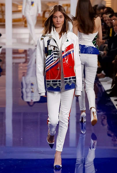 Самым нетипичным материалом для реализации морской тематики стала лакированная кожа. Блестящие куртки или брюки по достоинству оценят в тех уголках планеты, где лета можно не дождаться и в июле: такие и выглядят свежо, и замерзнуть не дадут. В России – то, что нужно!