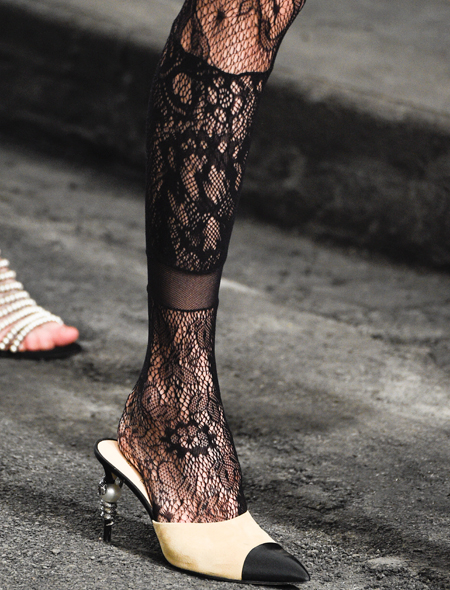 Не так давно кружевные колготки и чулки ассоциировались с вульгарностью и отсутствием вкуса, но, как мы знаем, мода - штука непостоянная. Последние пару сезонов демократичные марки нижнего белья скромно втискивали в свои коллекции одну-другую вещь с эффектом тату, но на большее не осмеливались. У Agent Provocateur и Oysho легко найти боди и бра из тонкого кружева, имитирующие нательные рисунки, но все это, как говориться, для домашнего использования. Креативный директор дома Chanel решил вывести тренд тату на новый уровень. На его показе модели гордо фланировали по декоративным парижским улицам в чулках, украшенных затейливыми цветочными узорами. Особенно сексуально и ничуть не вульгарно чулки-тату смотрелись с паре со строгим твидом и узкими юбками из лакированной кожи.