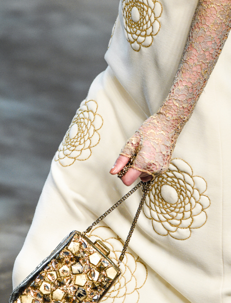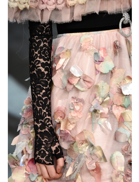 Кружево на «отлично» выполняет функции традиционного ювелирного украшения, и показ Chanel - явное тому доказательство. Ажурные митенки в сочетании с массивными браслетами и сверкающей сумочкой способны «сделать» любой образ. Руки и предплечья в таком «одеянии» выглядят куда изящнее, чем без него.