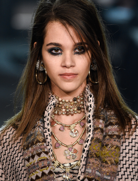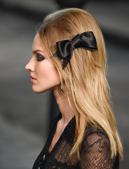 Модные украшения это не только золотые «побрякушки» и нарочитая бижутерия. Не удивимся, если в 2016 году их место займет что-то куда более простое и оттого гениальное. На показе Chanel добрая половина моделей выходила на подиум с очаровательными бантами из черного атласа в волосах. При этом и блондинки, и брюнетки смотрелись с этим украшением одинаково эффектно. Правда, чтобы повторить их успех необходимо выполнить два условия: сделать объемный начес на макушке и жирно подвести глаза черным карандашом.