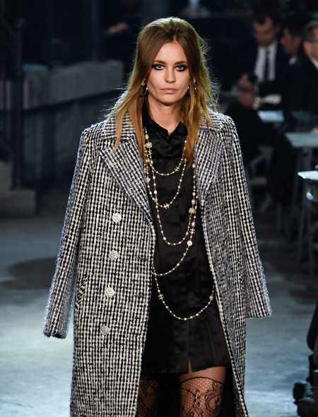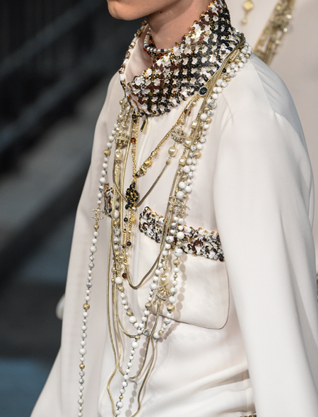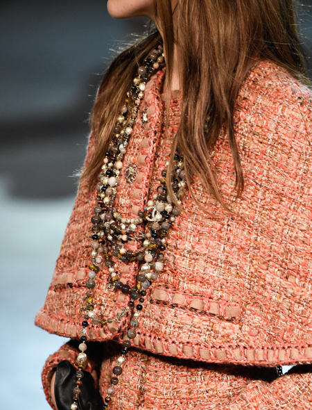 Модные нынче минимализм и лаконичность в стиле это, конечно, хорошо, но иногда все же так хочется дать волю фантазии! Надевать на себя все и сразу не возбраняется, если делать это так, как велит Лагерфельд. На показе мы видели девушек в твидовых жакетах и пальто, блузах свободного кроя и атласных платья-рубашках с неизменной гроздью украшений на шее. Коко Шанель как-то сказала: «Украшений должно быть много, но если они настоящие, это отдает хвастовством и дурным вкусом». Остается только последовать совету великой Мадемуазель и обзавестись парой-тройкой длинных ожерелий и цепочек. Карл Лагерфельд не постеснялся комбинировать в едином комплекте сразу несколько бус разной длины и, стоит заметить, даже с ожерельем-ошейником они смотрятся неплохо.