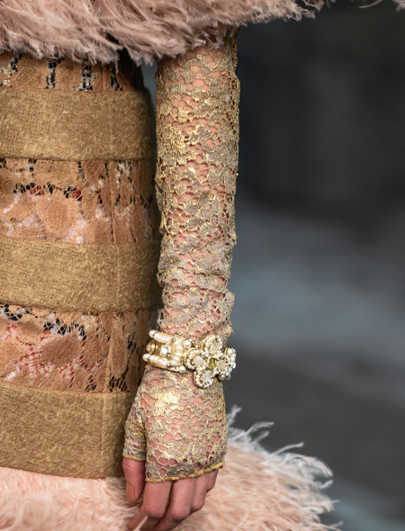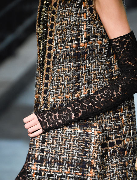 Кружево на «отлично» выполняет функции традиционного ювелирного украшения, и показ Chanel - явное тому доказательство. Ажурные митенки в сочетании с массивными браслетами и сверкающей сумочкой способны «сделать» любой образ. Руки и предплечья в таком «одеянии» выглядят куда изящнее, чем без него.