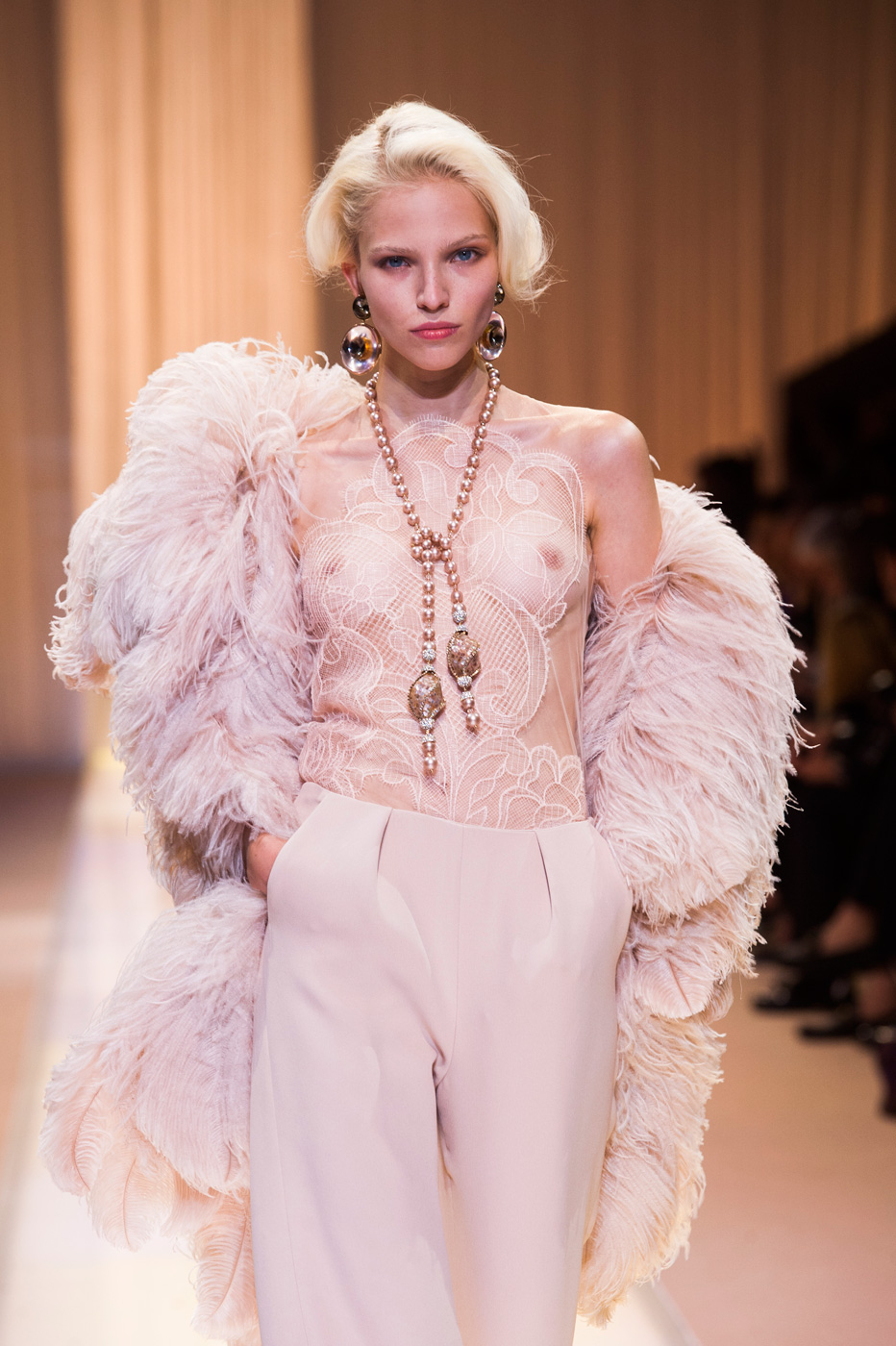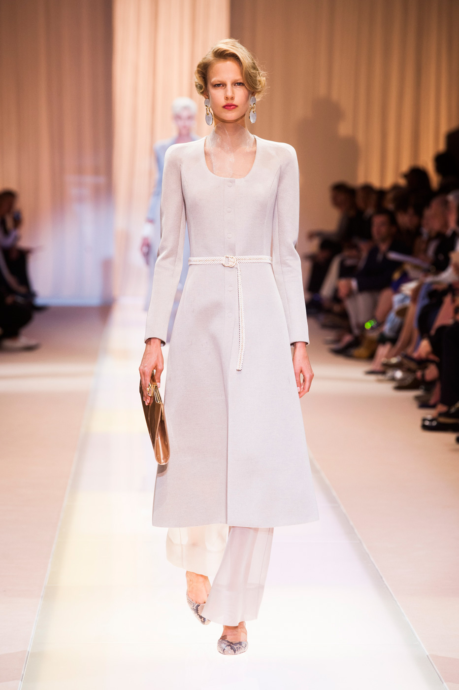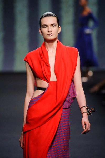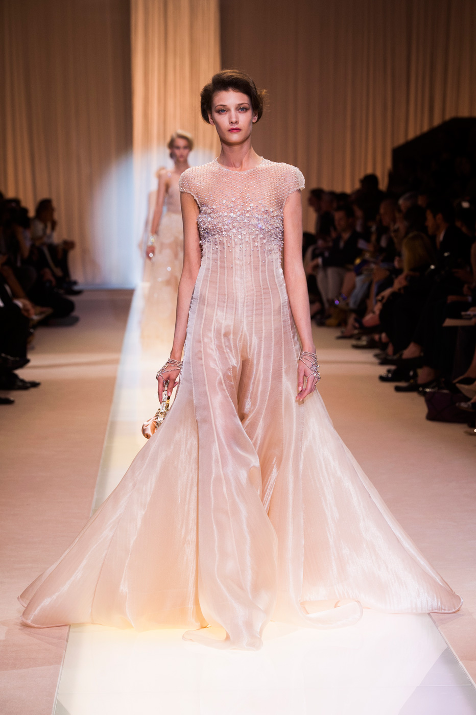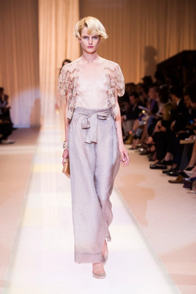 Джорджио Армани (Giorgio Armani) назвал кутюрную коллекцию Nude, но за кулисами использовал другое слово: «Элегантность». Так и было. Цвет пудры, нейтральный, бледно-розовый – любой из этих эпитетов подходит, чтобы описать палитру коллекции. Порой зрители путались в догадках – то ли это кожа модели, то ли ткань. Дизайнер не стал экспериментировать с кроем и сделал ставку на чувственность в стиле ар-деко и Золотого века Голливуда. После показа критики шепотом говорили друг другу: «Похоже, у Джорджио открылось второе дыхание».