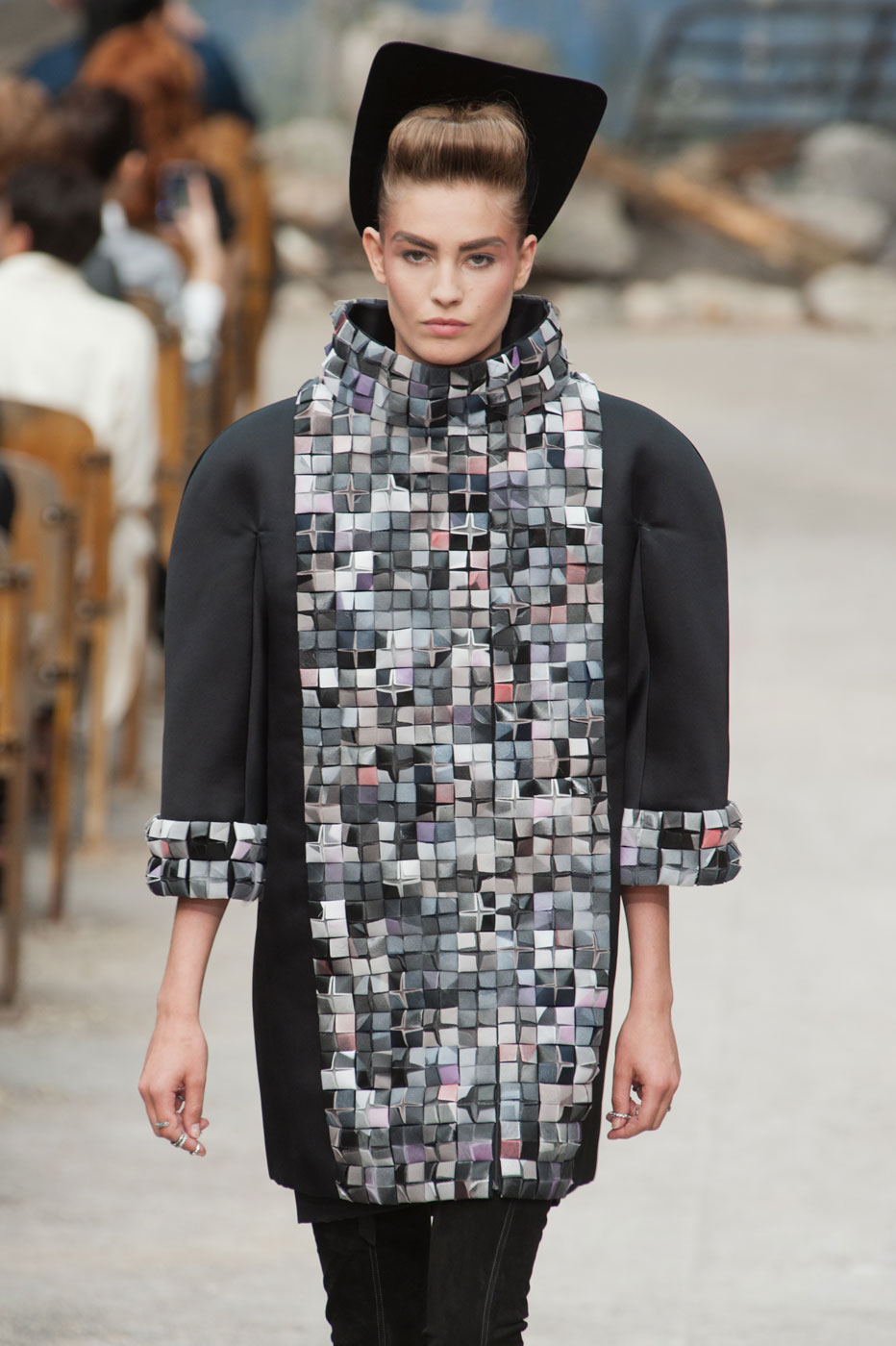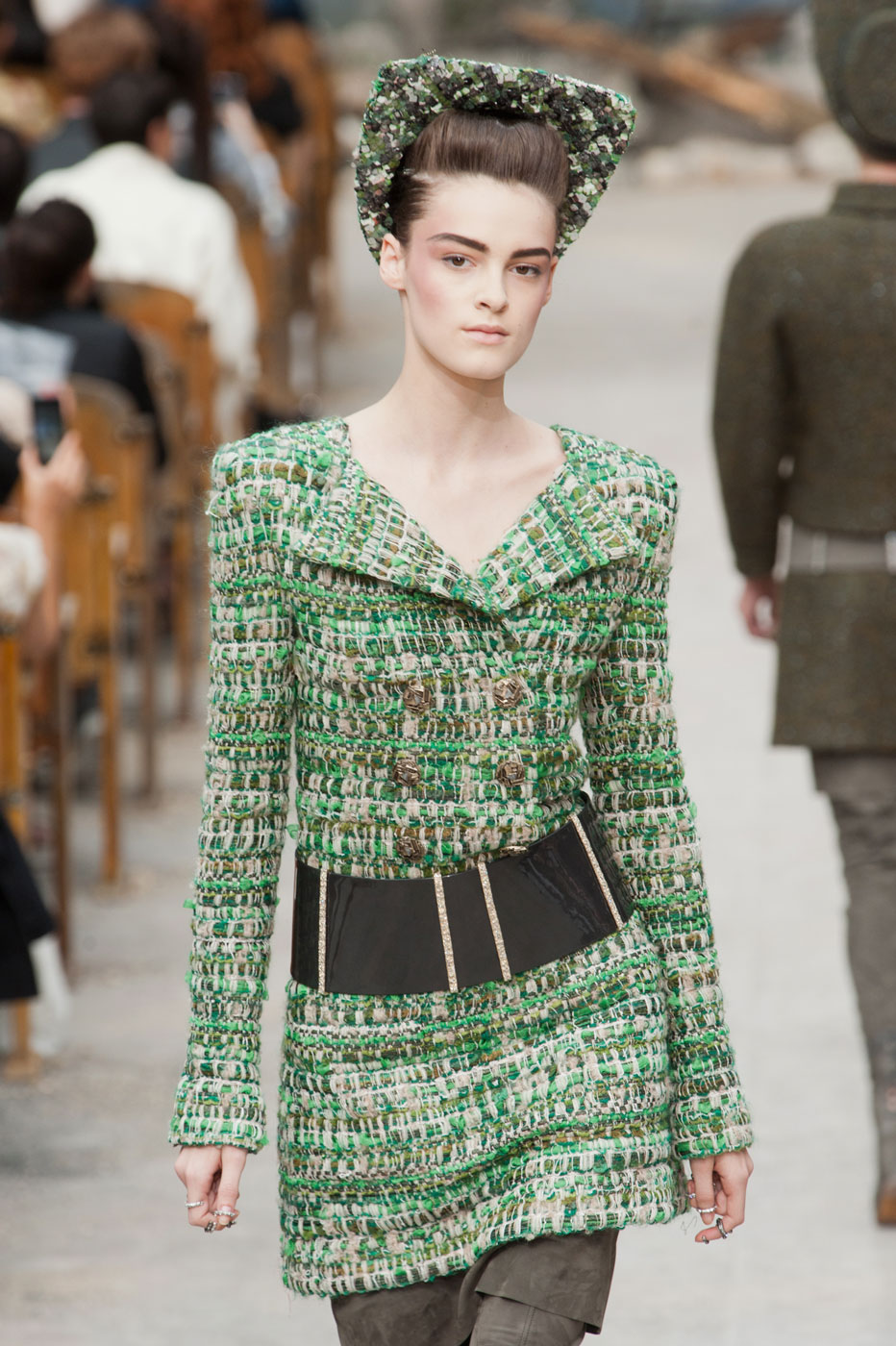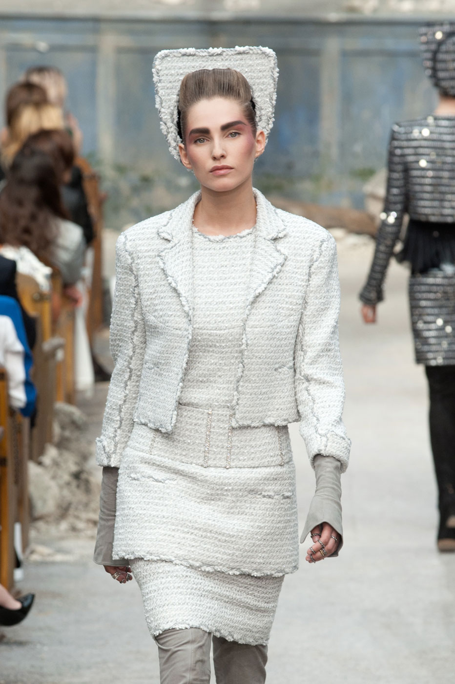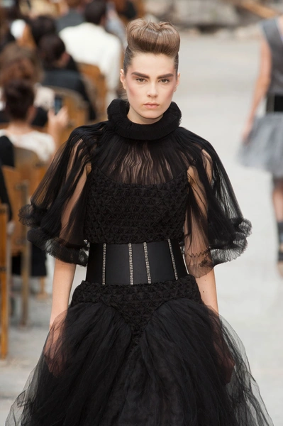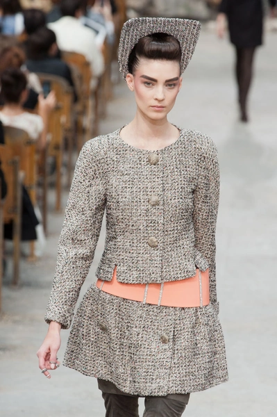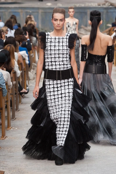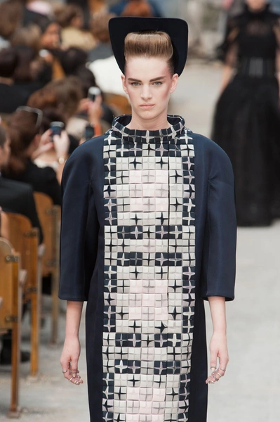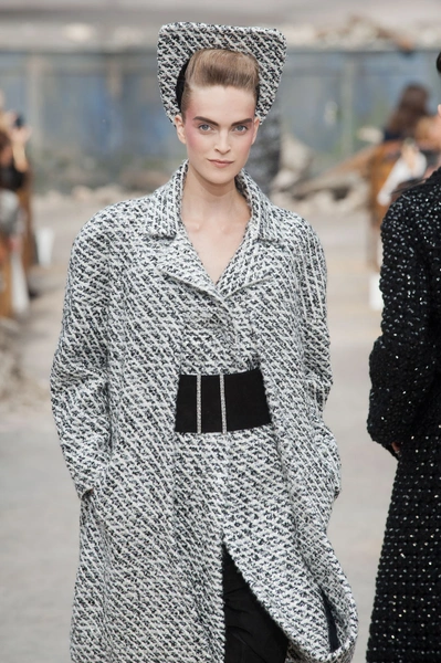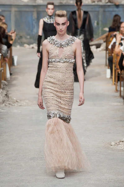 Гости, приезжавшие в Гранд-Пале на показ Chanel, оказывались в заброшенном старинном театре. Именно такие декорации для своего кутюрного шоу выбрал жесткий и бескомпромиссный Карл Лагерфельд (Karl Lagerfeld). Занавес распахнулся, и на полуразрушенной сцене на фоне огромной фотографии Города будущего стали появляться модели. Лагерфельд не просто так выбрал именно такую заставку для шоу – таким образом он противопоставил старый мир и новый мир, к которому мы все идем. Про коллекцию, впрочем, дизайнер сказал так: «Это традиция с большим будущим». Традиционные твидовые жакеты, викторианские силуэты, но при этом космические детали, сотканные будто из фольги или светящихся микросхем.