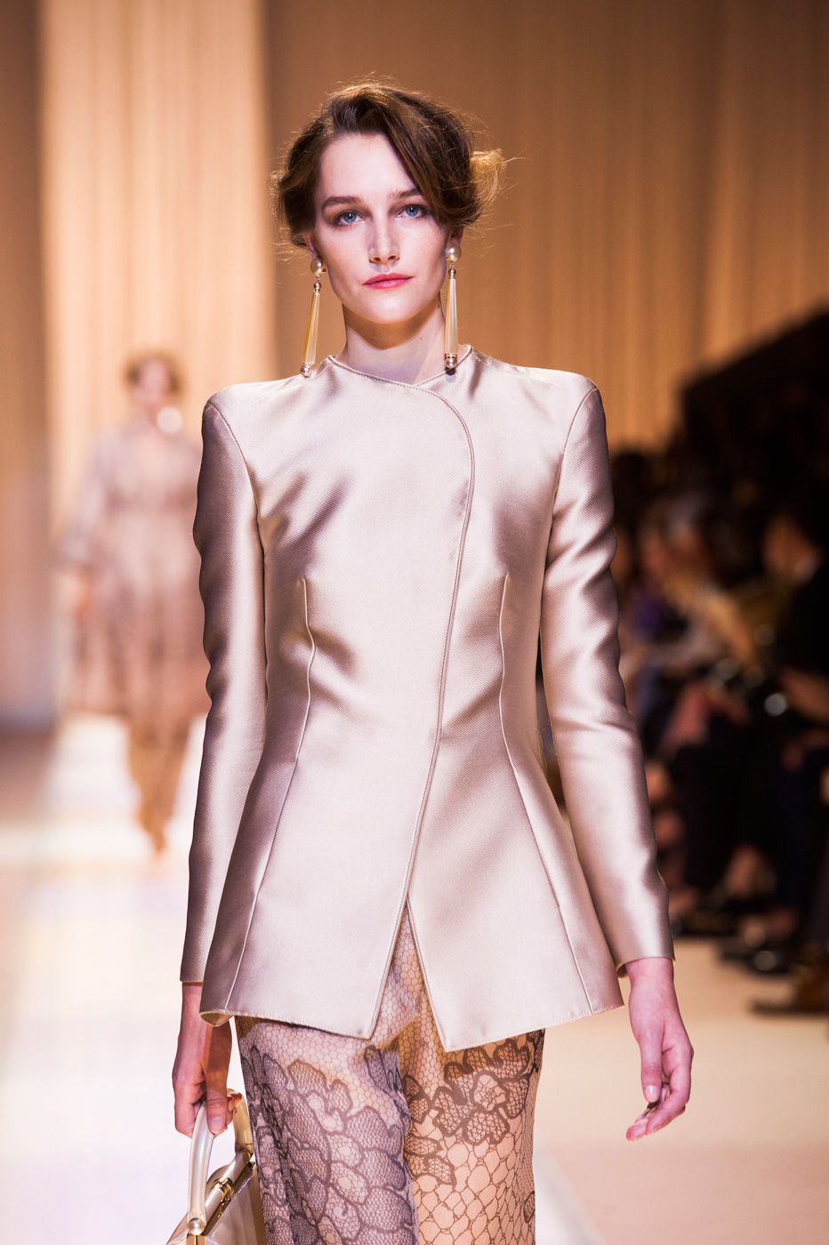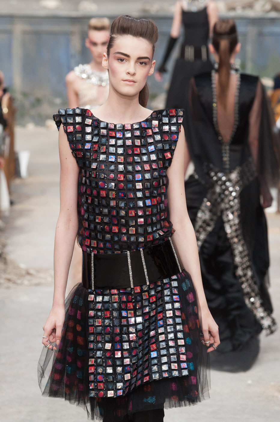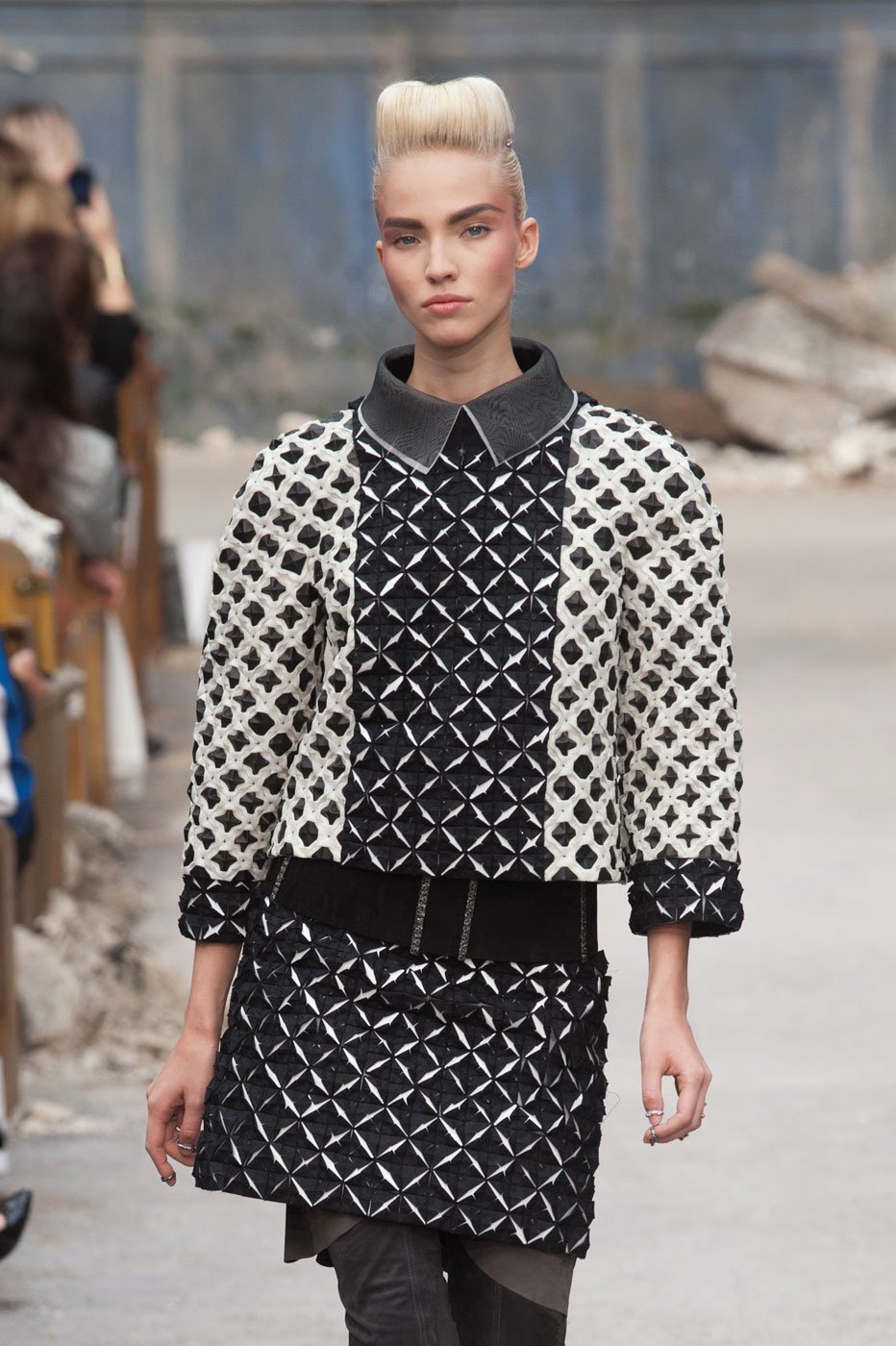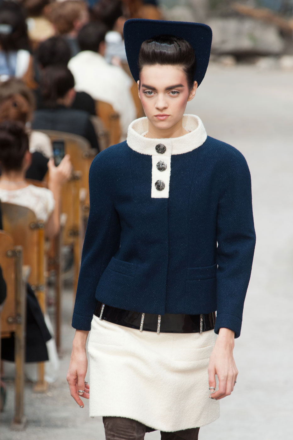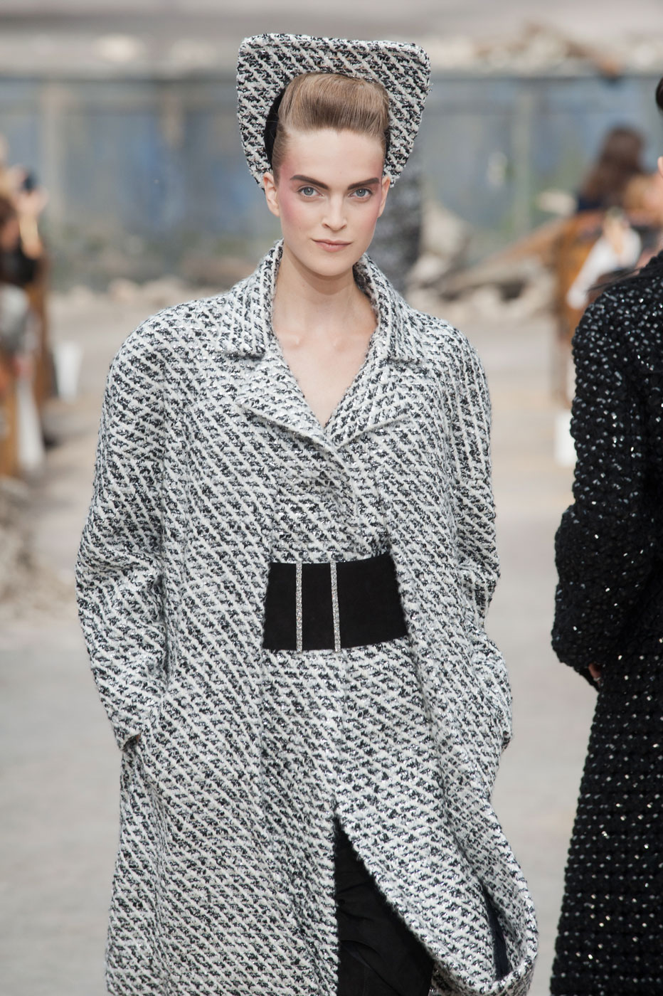 Гости, приезжавшие в Гранд-Пале на показ Chanel, оказывались в заброшенном старинном театре. Именно такие декорации для своего кутюрного шоу выбрал жесткий и бескомпромиссный Карл Лагерфельд (Karl Lagerfeld). Занавес распахнулся, и на полуразрушенной сцене на фоне огромной фотографии Города будущего стали появляться модели. Лагерфельд не просто так выбрал именно такую заставку для шоу – таким образом он противопоставил старый мир и новый мир, к которому мы все идем. Про коллекцию, впрочем, дизайнер сказал так: «Это традиция с большим будущим». Традиционные твидовые жакеты, викторианские силуэты, но при этом космические детали, сотканные будто из фольги или светящихся микросхем.
