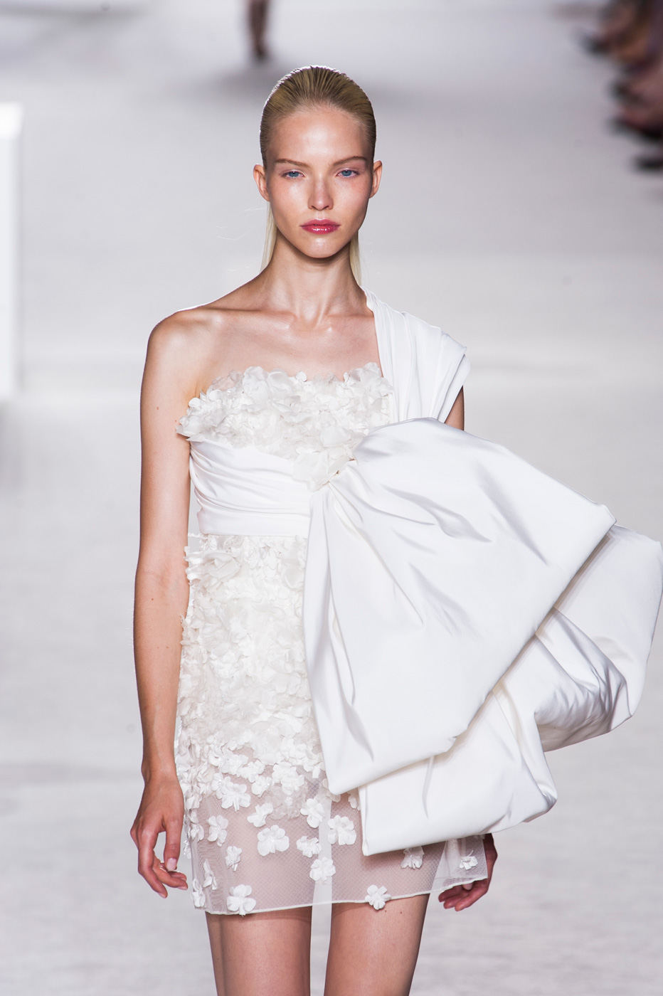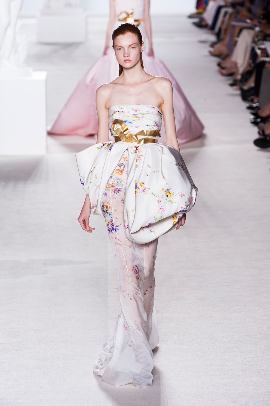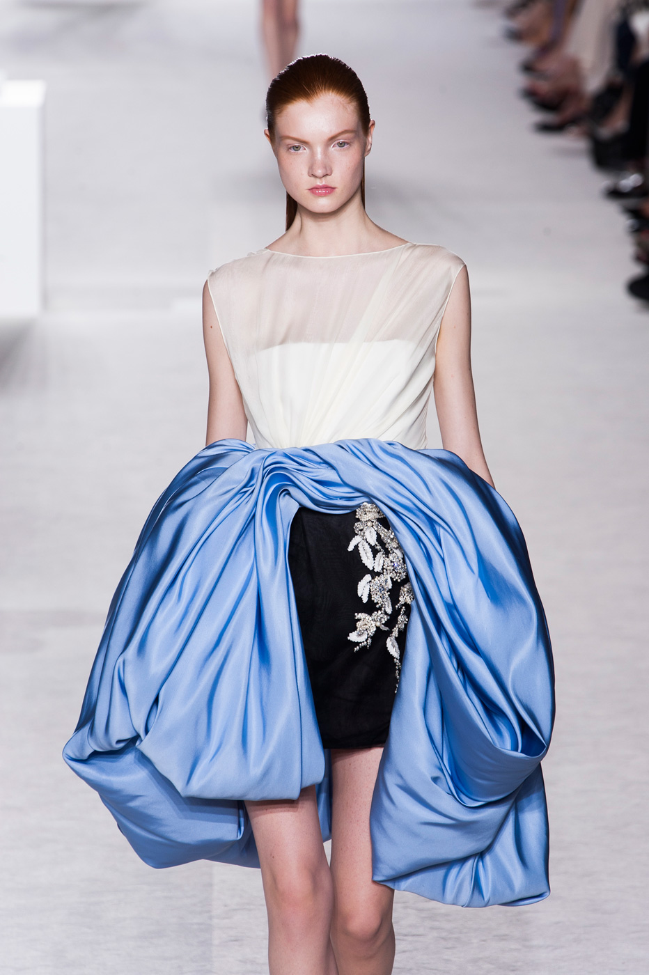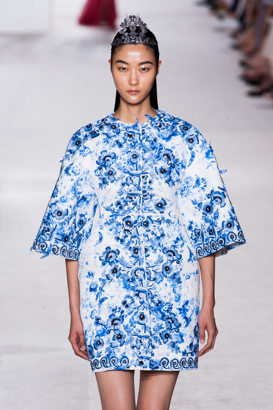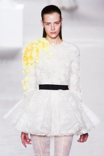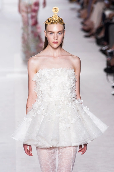 Пятое по счету шоу Giambattista Valli стало самым громким за всю короткую (ну что такое пять показов?) кутюрную карьеру дизайнера. «Девушки ждут от меня цветов, и я готов их им дать», – признался Джамбаттиста Валли (Giambattista Valli). Но источником вдохновения для коллекции послужили не букеты и поля, а фарфор. Дизайнер использовал ДНК самых знаменитых фарфоровых фабрик мира – итальянской Каподимонте (платья белого и серого цветов), английской Веджвуд (сине-белые тона), французской Севр (несколько энергичных выходов в красном). Последними на подиум вышли модели в платьях, на которые Валли вдохновил разноцветный фарфор немецкой фабрики Мейсен. В этот момент Instagram (запрещенная в России экстремистская организация) завис от обилия желающих поскорее поделиться красотой.