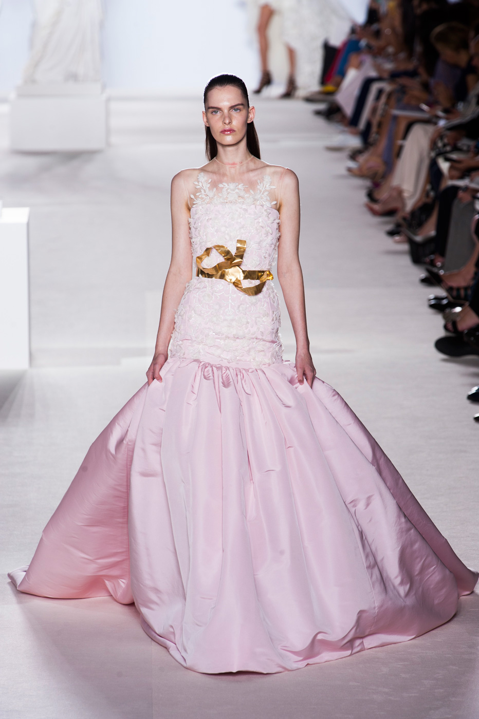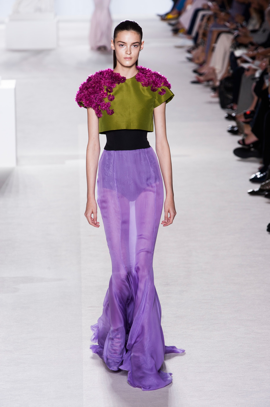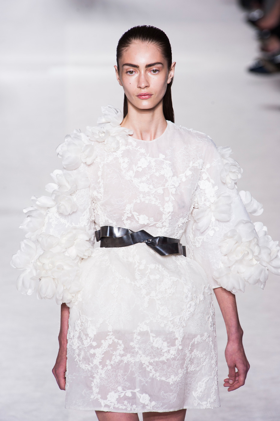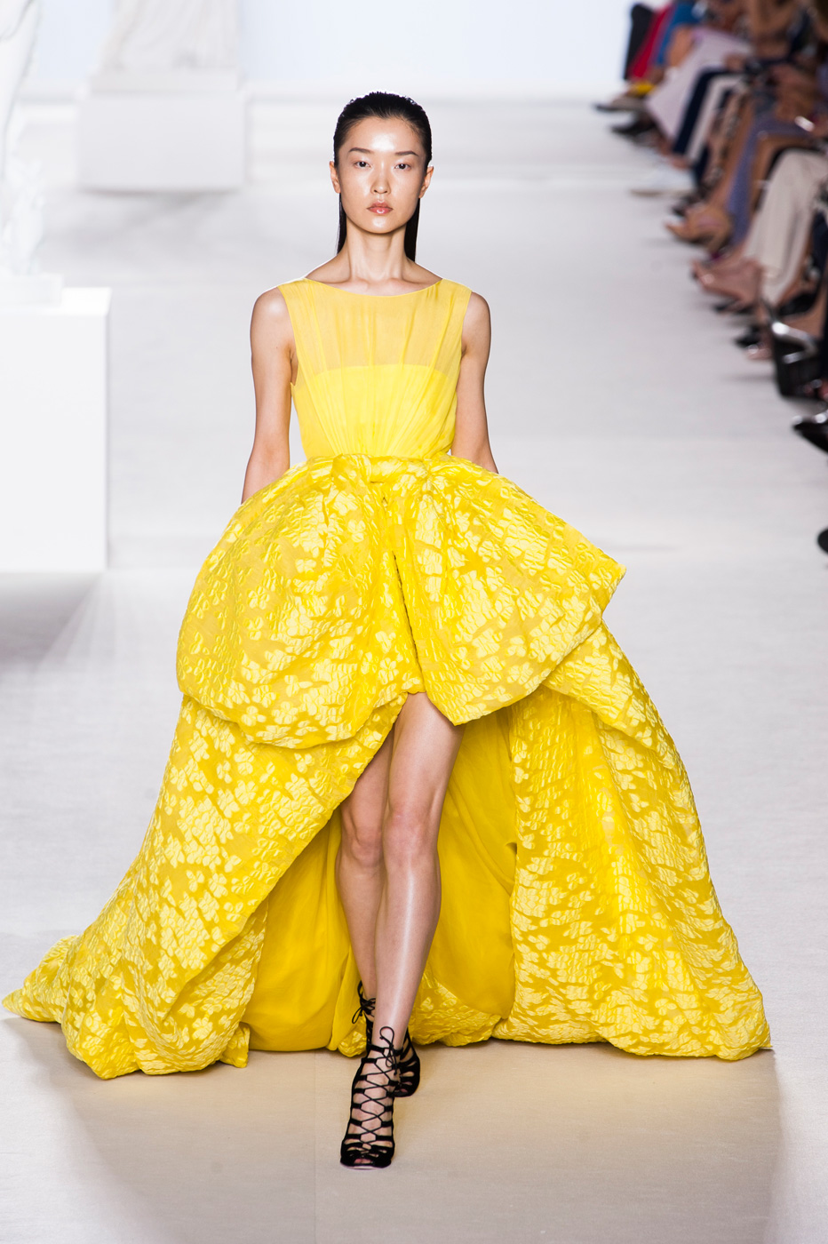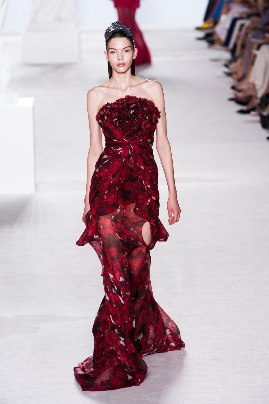 Пятое по счету шоу Giambattista Valli стало самым громким за всю короткую (ну что такое пять показов?) кутюрную карьеру дизайнера. «Девушки ждут от меня цветов, и я готов их им дать», – признался Джамбаттиста Валли (Giambattista Valli). Но источником вдохновения для коллекции послужили не букеты и поля, а фарфор. Дизайнер использовал ДНК самых знаменитых фарфоровых фабрик мира – итальянской Каподимонте (платья белого и серого цветов), английской Веджвуд (сине-белые тона), французской Севр (несколько энергичных выходов в красном). Последними на подиум вышли модели в платьях, на которые Валли вдохновил разноцветный фарфор немецкой фабрики Мейсен. В этот момент Instagram (запрещенная в России экстремистская организация) завис от обилия желающих поскорее поделиться красотой.