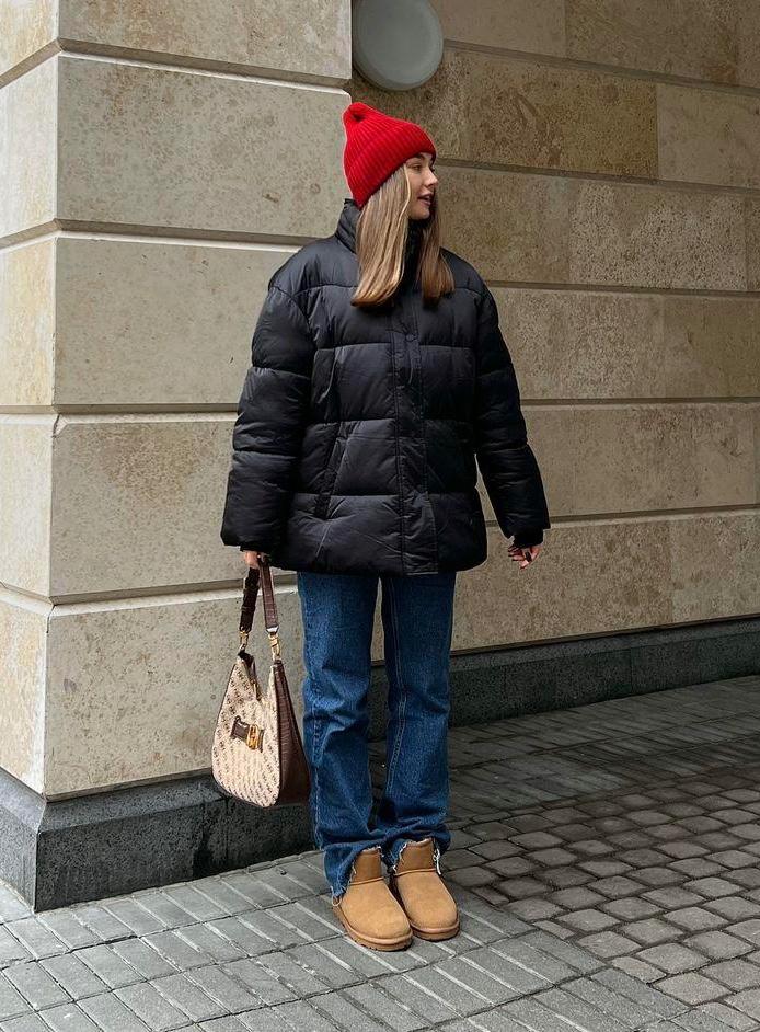 Оптимально работают синие или темные джинсы в паре с пуховиком насыщенного оттенка, базовым трикотажем и грубыми ботинками или утепленными уггами. Любительницам денима стоит попробовать тотал‑лук и добавить к нему укороченную куртку и акцентную сумку — теперь это городская классика нового сезона.
