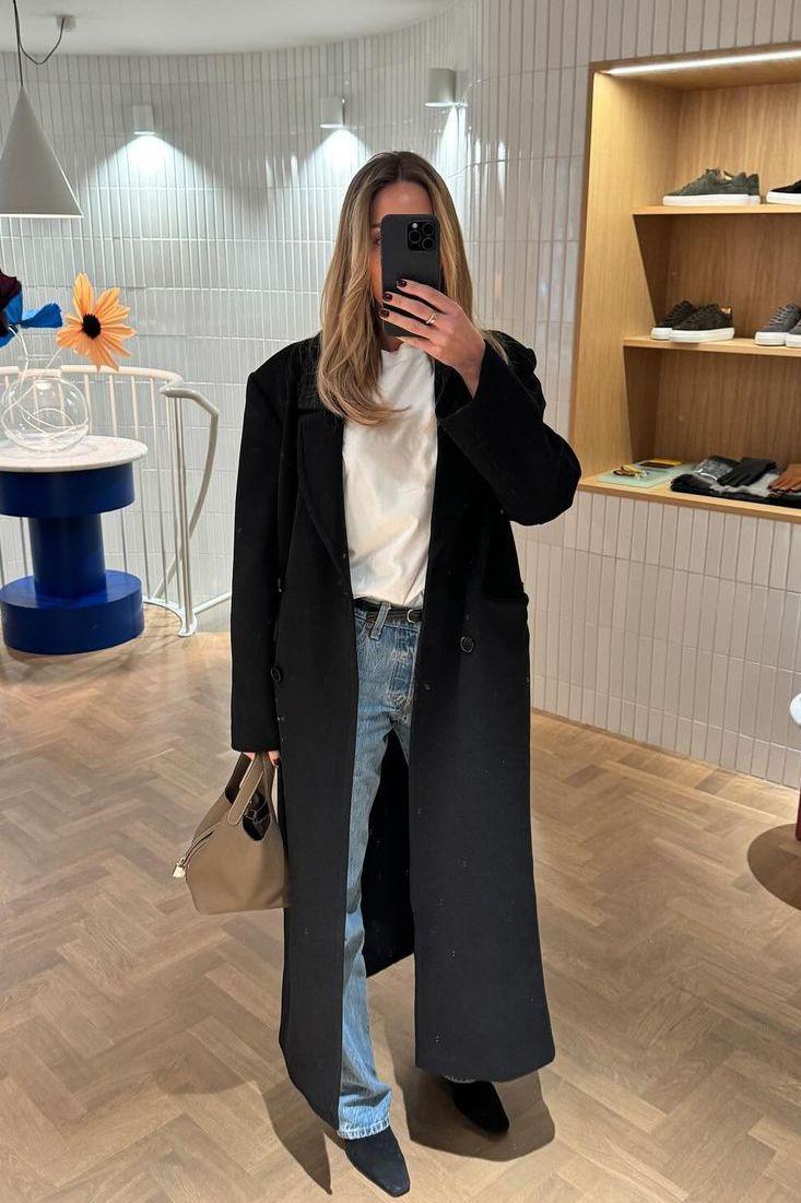 Лучше всего смотрятся нейтральные оттенки пальто — черный, бежевый, темно‑серый — и джинсы спокойного синего или серого цвета. Добавьте тонкий трикотаж или водолазку, ботильоны на устойчивом каблуке и аккуратный ремень: в итоге деним будет выглядеть как часть продуманного образа, а не как вынужденная замена классическим брюкам.